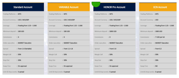 - Tài khoản Honor Pro: Với loại tài khoản này, số tiền gửi tối thiểu tăng lên mức 5.000 USD. Các đồng tiền giao dịch bao gồm USD, AED hoặc GBP. Tài khoản sử dụng nền tảng MetaTrader 5 và có mức chênh lệch từ 1:25 đến 1:500. Tài khoản này không có hoa hồng, mức chênh lệch bắt đầu từ 0,8 pip. Lệnh ký quỹ được đặt ở mức 50% và mức dừng là 30%, quy mô giao dịch tối thiểu là 1 lô và tối đa là 20 lô.