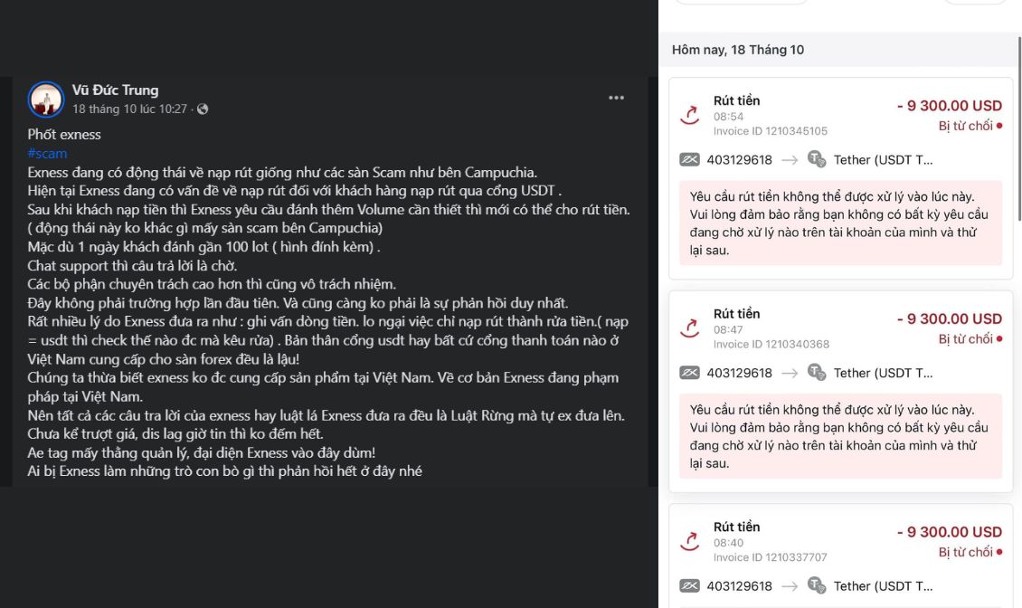 Nổi bật nhất trong số đó là tin tố cáo của anh V.Đ.T về việc Exness đang có rất nhiều lỗi khi nạp rút qua ví USDT. Điều đặc biệt khiến tin tố cáo này nhận được nhiều sự chú ý chính là việc anh V.Đ.T có đưa ra các dẫn chứng rất cụ thể với hình ảnh rõ ràng. Trong đó có thông tin về việc Exness báo lỗi “Rút tiền – Bị từ chối” khi sử dụng ví USDT.