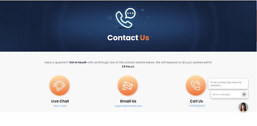 Nếu các bạn muốn liên hệ với HonorFX để được giải đáp thắc mắc hoặc quan tâm thông qua một số kênh khác nhau. Bạn có thể nhờ bất cứ ai bạn muốn gửi những câu hỏi bạn đã điền lên mạng và nhận câu trả lời qua email. Bạn cũng có thể gửi email trực tiếp cho bộ phận hỗ trợ hoặc gọi điện để nói chuyện trực tiếp với tư vấn viên. Bộ phận hỗ trợ không thông báo thời gian mở và đóng cụ thể.