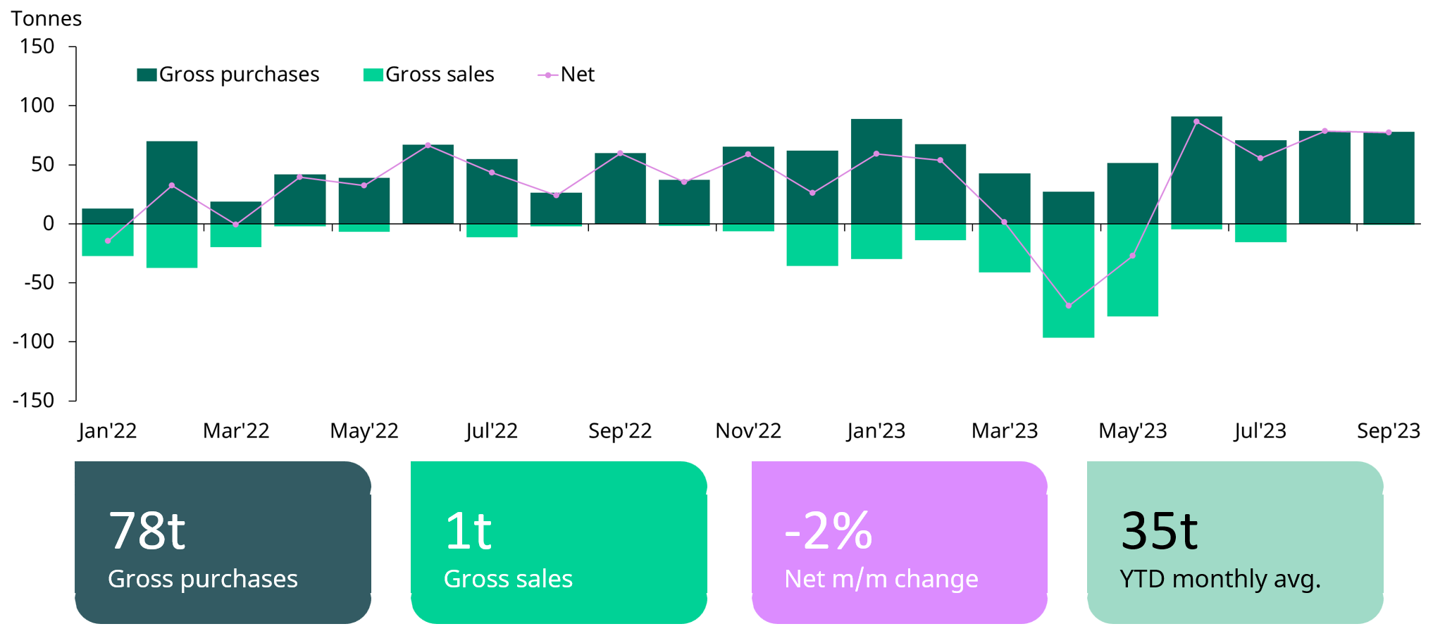 Chuyên gia Gopaul cho biết trong một bản cập nhật hôm thứ Năm: “Dự trữ vàng của ngân hàng trung ương toàn cầu được báo cáo, thông qua Quỹ Tiền tệ Quốc tế (IMF) và các nguồn công khai, đã tăng ròng 77 tấn trong tháng 9”. “Tổng doanh thu (1tấn) bị lấn át bởi tổng lượng mua (78tấn), làm nổi bật sức mua.”